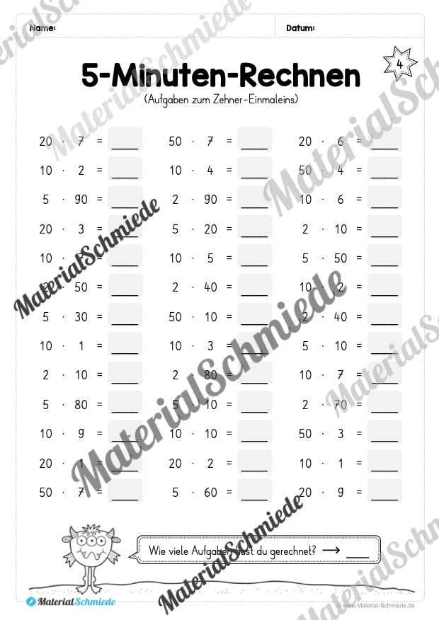 Dieses Arbeitsheft enthält insgesamt 15 Arbeitsblätter zum Thema 5-Minuten-Rechnen zum Zehner-Einmaleins im Zahlenraum 1.000 mit Aufgaben zur Multiplikation.