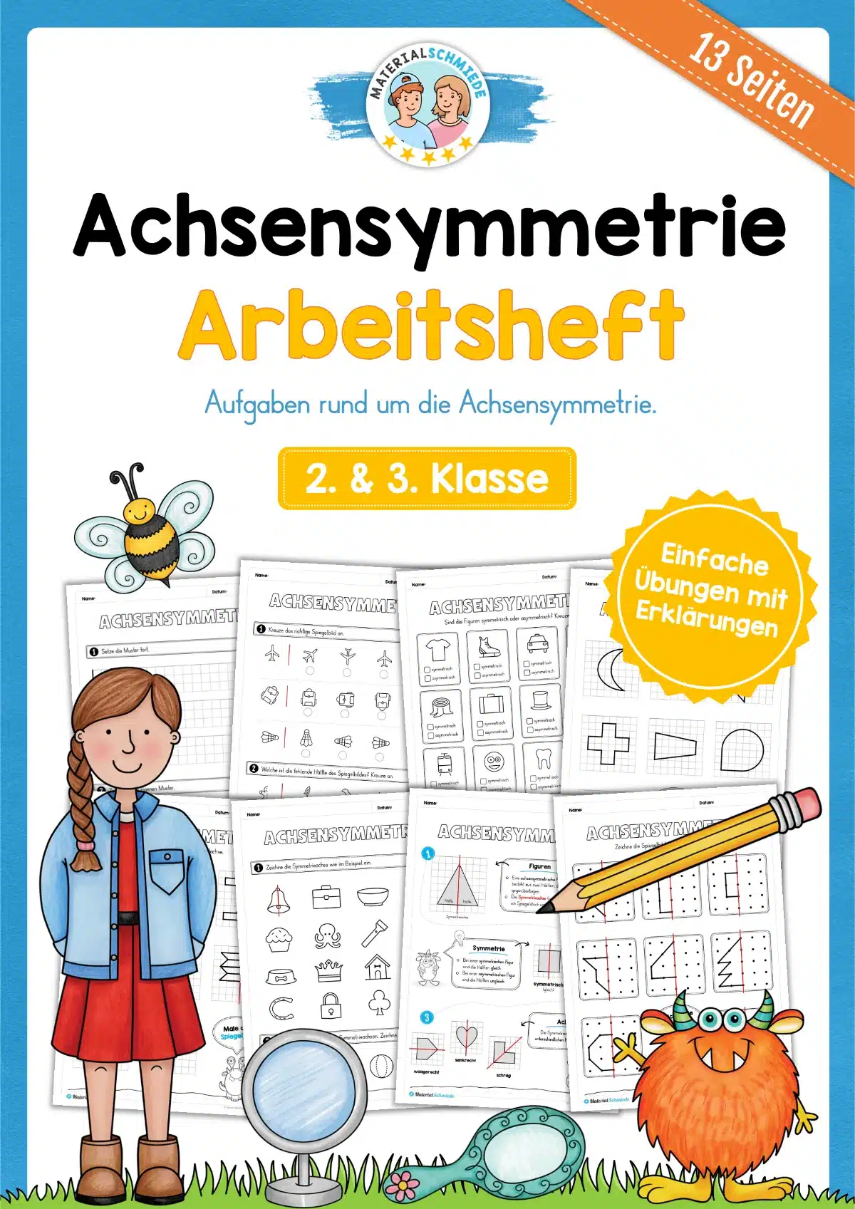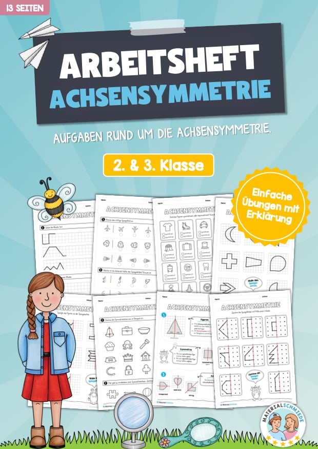 Hier findet ihr ein Arbeitsheft zum Thema Achsensymmetrie mit insgesamt 13 Seiten für die 2. und 3. Klasse.