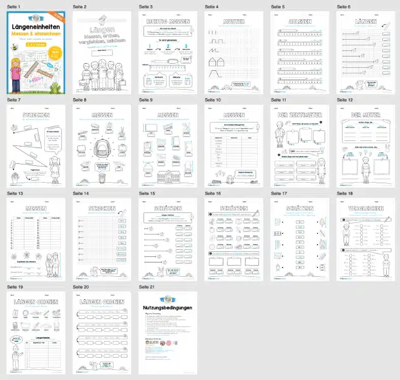 Hier findet ihr ein Arbeitsheft zum Thema Längen. Auf insgesamt 19 Seiten geht es rund um das Thema Messen von Längen und Längeneinheiten.