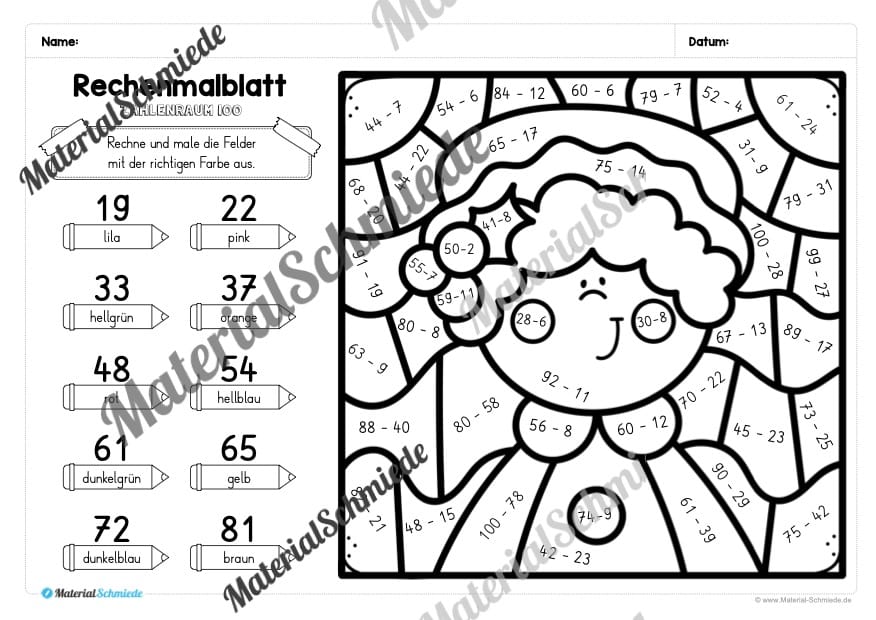 Die Schüler sollen die Rechenaufgaben auf den Arbeitsblättern lösen. Je nach Ergebnis, soll eine andere (vorgegebene) Farbe ausgemalt werden.
