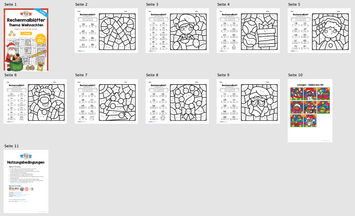 Dieses Materialpaket beinhaltet 8 Rechenmalblätter zu Weihnachten mit Übungen im Zahlenraum 100 mit Aufgaben zur Addition und Subtraktion.