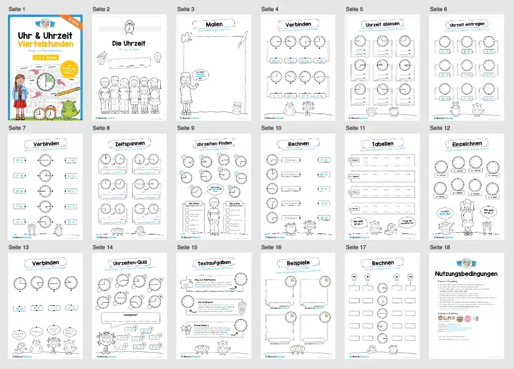 Die Aufgaben sind relativ einfach gehalten, um den Kindern das Thema Uhr und Uhrzeit näher zu bringen. Bei allen Aufgaben und Übungen in diesem Materialpaket wird mit Viertelstunden gearbeitet. Nachfolgend findet ihr einen Überblick, welche Arbeitsblätter in dem Materialpaket enthalten sind: