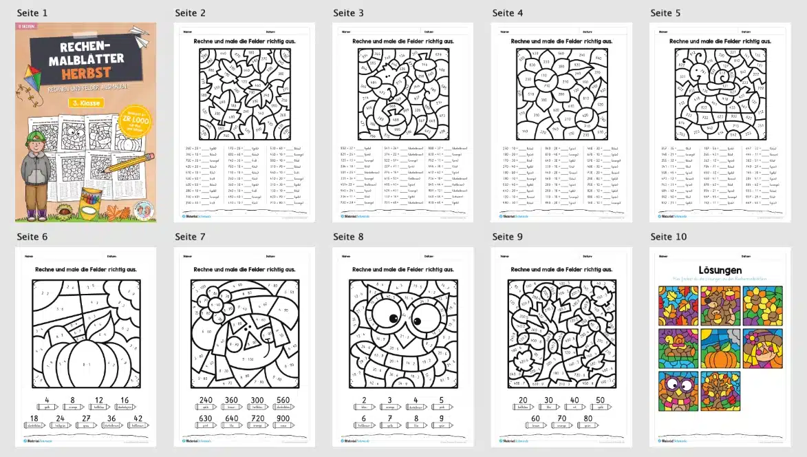 Dieses Materialpaket beinhaltet 8 Rechenmalblätter zum Herbst mit Übungen im Zahlenraum 1.000.