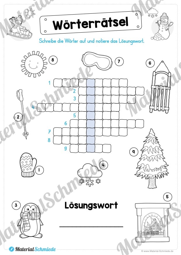 Dieses Materialpaket enthält insgesamt 15 einfache Rätsel zum Thema Winter für Kinder in der 1. und 2. Klasse inkl. Lösungen.