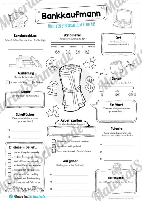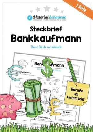 Auf dem Steckbrief sollen die Kinder die wichtigsten Eigenschaften rund um den Beruf des Bankkaufmanns notieren: