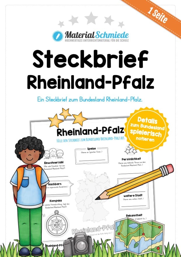 Auf dem Steckbrief zum Bundesland Rheinland-Pfalz sollen die Schüler alle wichtigen Informationen rund um das Bundesland Rheinland-Pfalz eintragen. Neben der Einwohneranzahl, der Lage und den angrenzenden Bundesländern sollen die Kinder ebenfalls etwas über die Eigenschaften von Rheinland-Pfalz notieren. Wofür ist Rheinland-Pfalz bekannt oder welche Sehenswürdigkeiten und besonderen Gerichte es in Rheinland-Pfalz gibt.