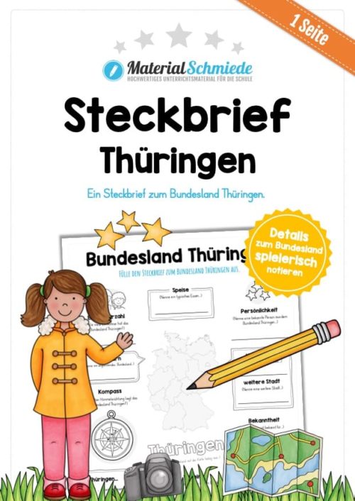 Auf dem Steckbrief zum Bundesland Thüringen sollen die Schüler alle wichtigen Informationen rund um das Bundesland Thüringen eintragen. Neben der Einwohneranzahl, der Lage und den angrenzenden Bundesländern sollen die Kinder ebenfalls etwas über die Eigenschaften von Thüringen notieren. Wofür ist Thüringen bekannt oder welche Sehenswürdigkeiten und besonderen Gerichte es in Thüringen gibt.