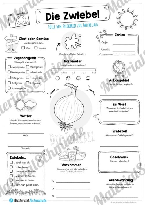 Auf dem Steckbrief sollen die Kinder die wichtigsten Eigenschaften rund um die Zwiebel notieren: