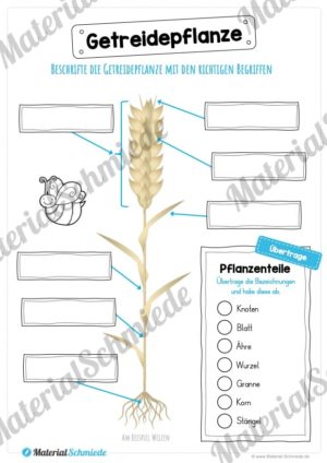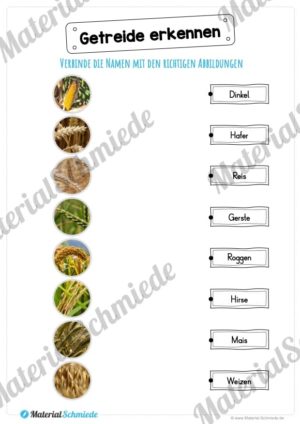 Mit Hilfe von dem Materialpaket sollen die Schüler lernen, verschiedene Getreidearten unterscheiden zu können. Dabei geht es um die Benennung von Getreide sowie die Verbindung mit dessen Korn. Die folgenden Arbeitsblätter sind in dem Materialpaket enthalten:
