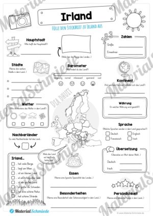 Auf dem Steckbrief sollen die Kinder die wichtigsten Eigenschaften rund um Irland notieren: