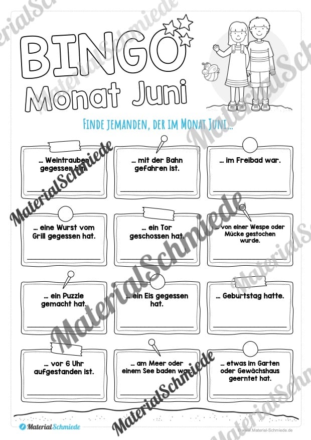 Die Schüler sollen jeweils jemanden in der Schulklasse finden, der im Monat Juni etwas Bestimmtes erlebt hat. Ist jemand gefunden, so soll der Name notiert werden.
