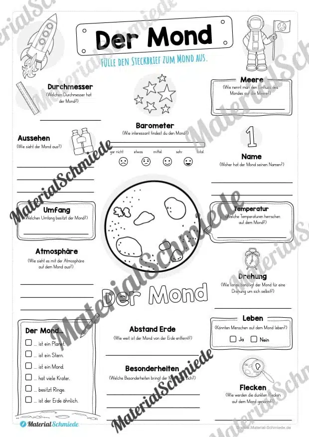 Die Kinder sollen auf dem Steckbrief unter anderem folgende Informationen zum Mond notieren: