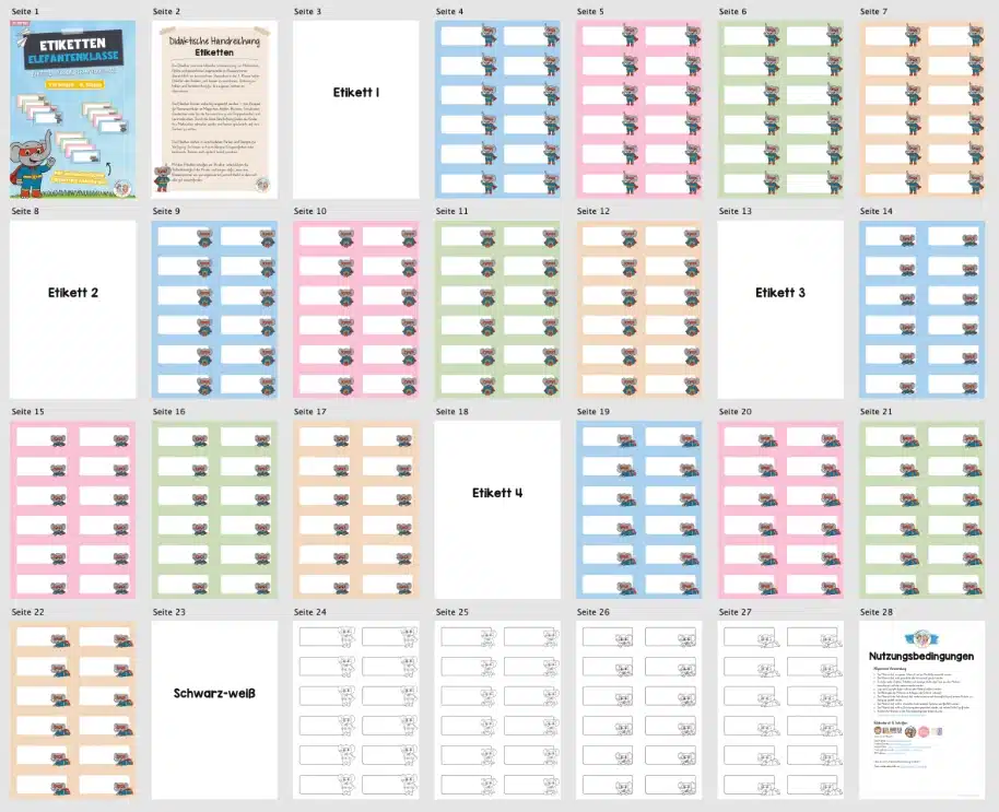 Die Etiketten können vielseitig eingesetzt werden – zum Beispiel für Namensschilder an Mäppchen, Heften, Büchern, Schubladen, Garderoben oder für die Kennzeichnung von Gruppentischen und Lernmaterialien. Durch die klare Beschriftung finden die Kinder ihre Materialien schneller wieder und lernen spielerisch, auf ihre Sachen zu achten.