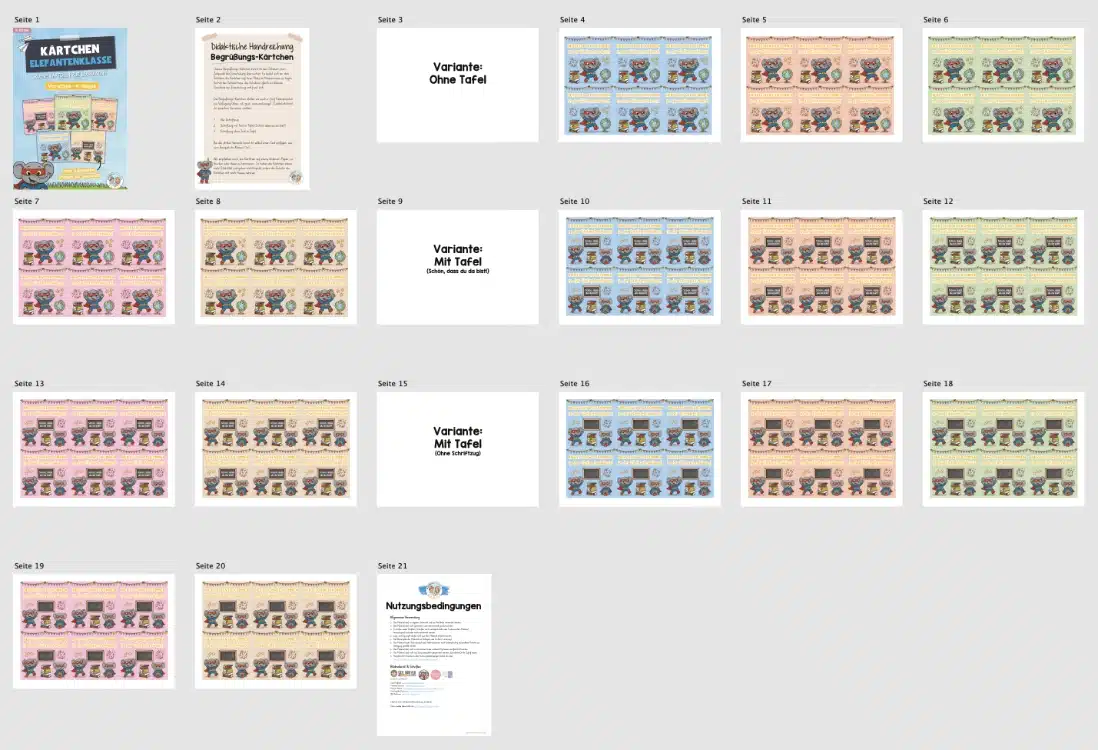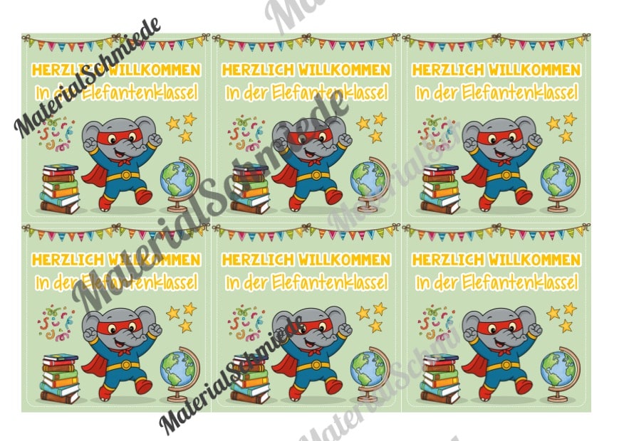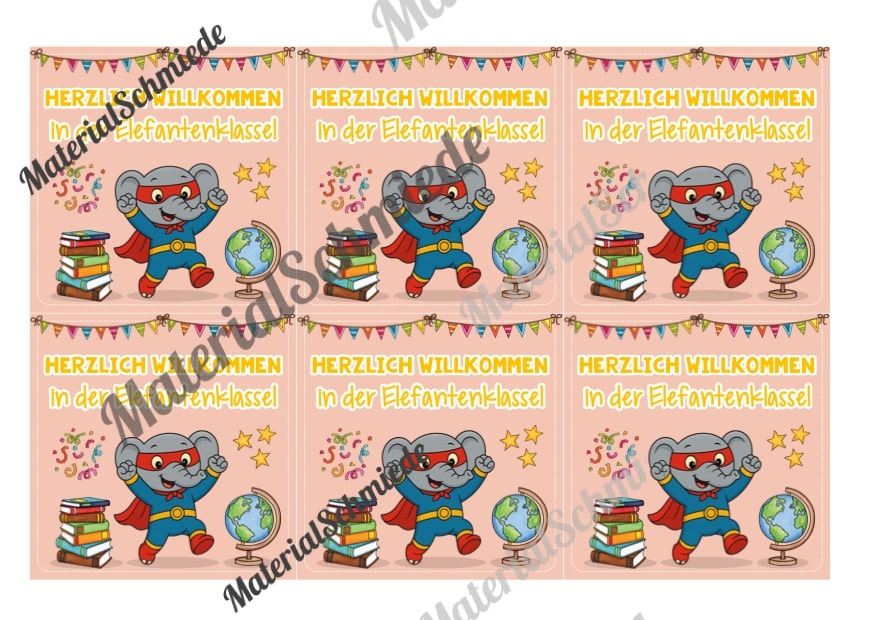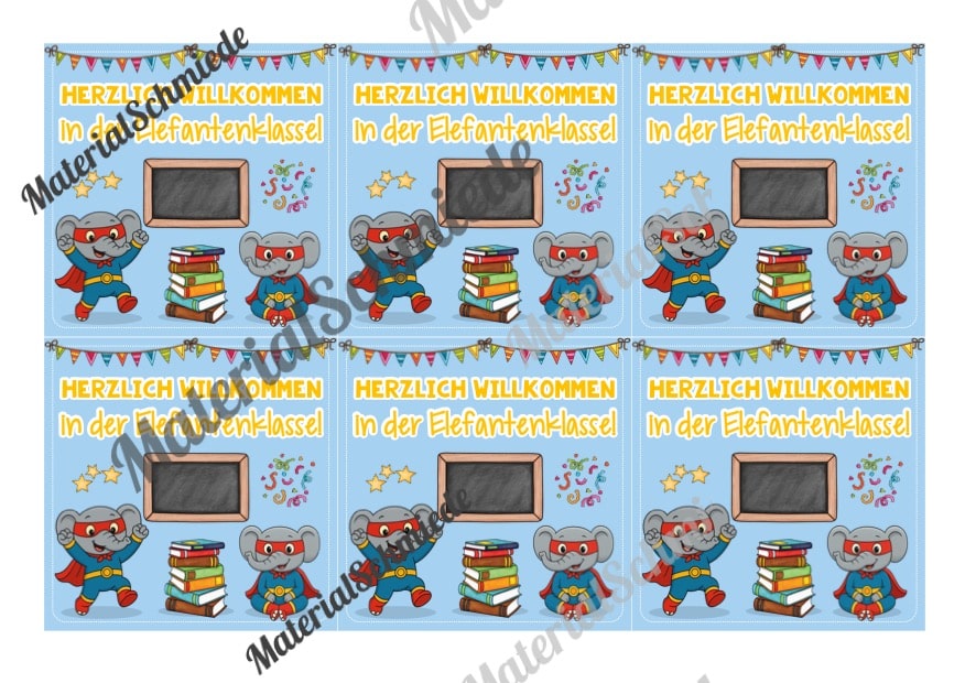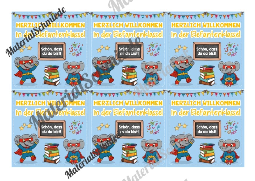 Hier findet ihr 5 Begrüßungs-Kärtchen für die Elefantenklasse.