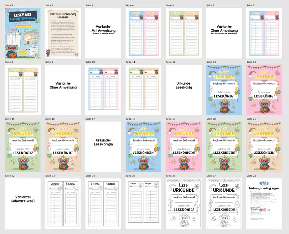 Wir haben verschiedene Varianten erstellt. So könnt ihr beim Lesepass die Vorlage mit den „10 Minuten lesen“ nutzen, selbst eine Anweisung eintragen (hierfür ist in einer Zeile Platz gelassen) oder die Variante ohne Anweisung verwenden. Für die Leseurkunden findet ihr Vorlagen für den Lesekönig und die Lesekönigin – jeweils in verschiedenen Farben. Und das ganze dann noch einmal in schwarz-weiß.