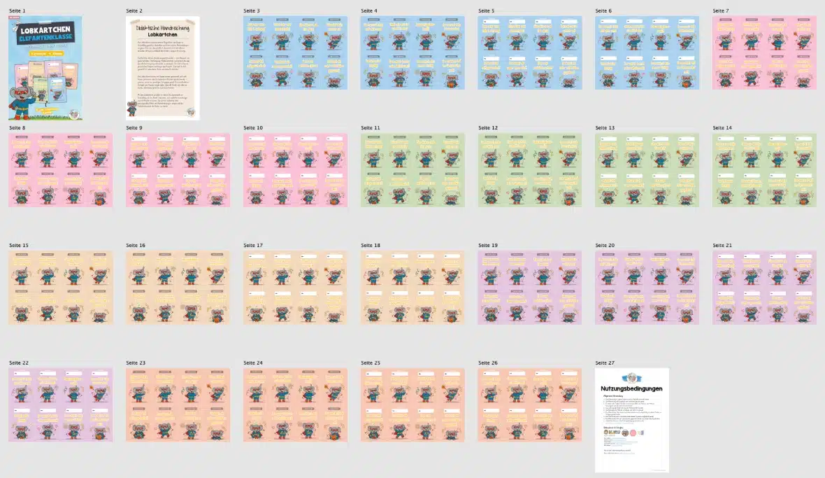 Wir stellen euch insgesamt 16 Lobkärtchen zur Verfügung. Diese findet ihr jeweils mit bzw. ohne Feld zur Eintragung des Namens für das Kind. Diese Varianten stehen in 6 Farben bereit.