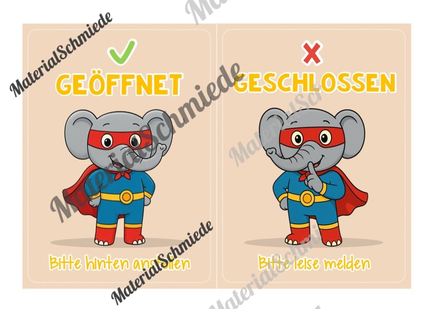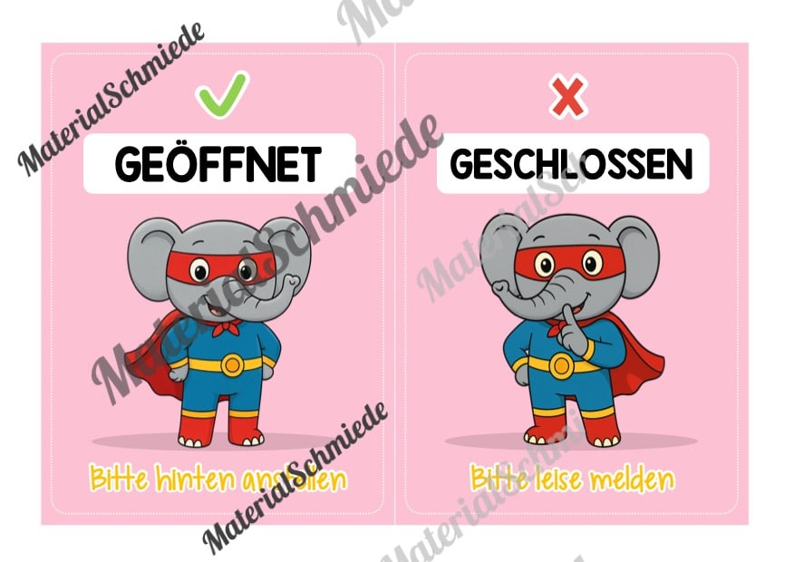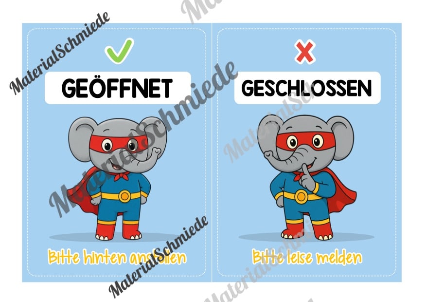 Die Karte „Geöffnet – bitte hinten anstellen“ zeigt den Kindern, dass sie in diesem Moment Fragen direkt am Pult klären können. Dabei lernen die Kinder, sich in einer kleinen Warteschlange zu organisieren und zu warten, bis sie an der Reihe sind. Die Karte hilft dabei, dass der Ablauf ruhig bleibt und nicht zu viele Kinder gleichzeitig ans Pult drängen.