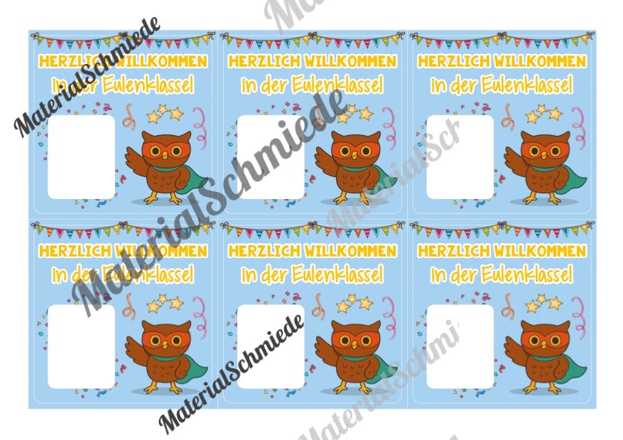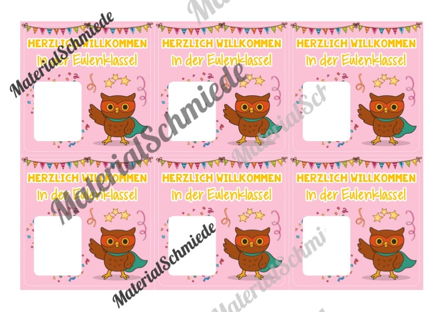 Auf den Kärtchen ist jeweils auf einer weißen Fläche Platz für ein Willkommensgeschenk gelassen. Welches Willkommensgeschenk ihr wählt, ist euch selbst überlassen. Dies kann ein Radiergummi, ein Bonbon, ein Traubenzucker oder eine andere Süßigkeit sein. Die weiße Fläche ist 3,2cm breit und 4cm hoch.