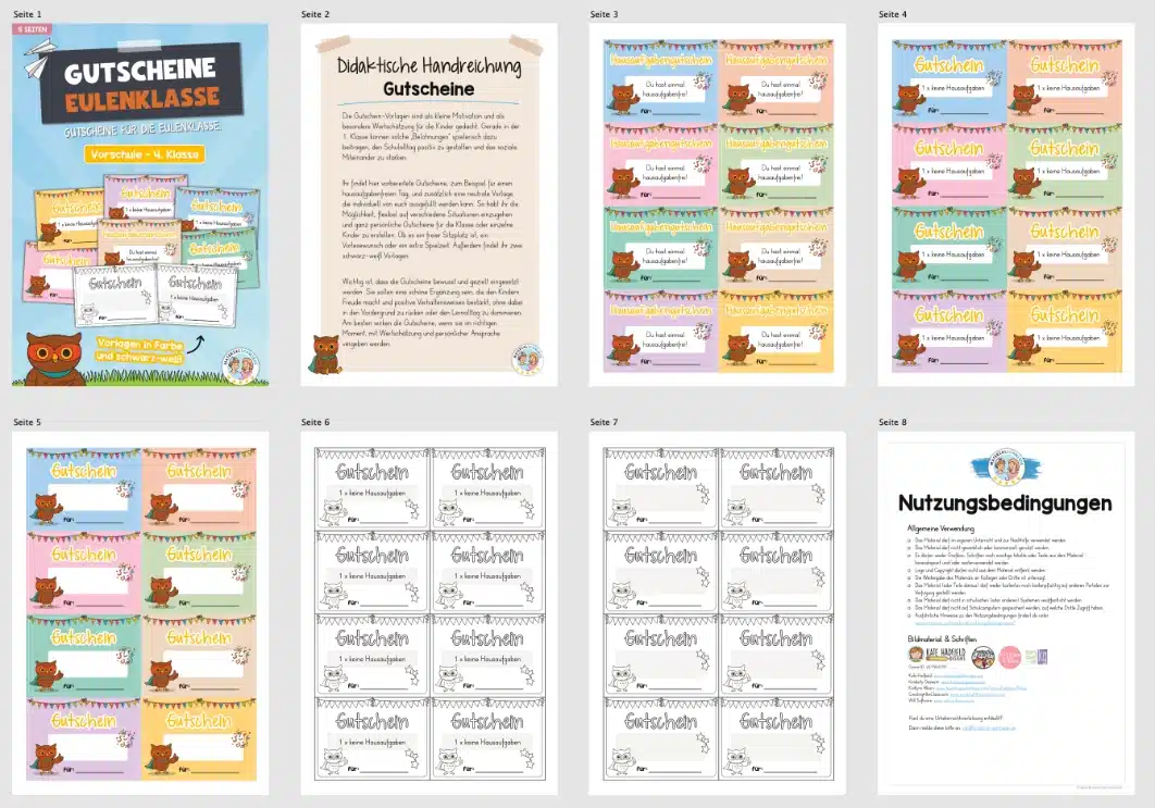 Die Gutschein-Vorlagen sind als kleine Motivation und als besondere Wertschätzung für die Kinder gedacht. Gerade in der 1. Klasse können solche „Belohnungen“ spielerisch dazu beitragen, den Schulalltag positiv zu gestalten und das soziale Miteinander zu stärken.