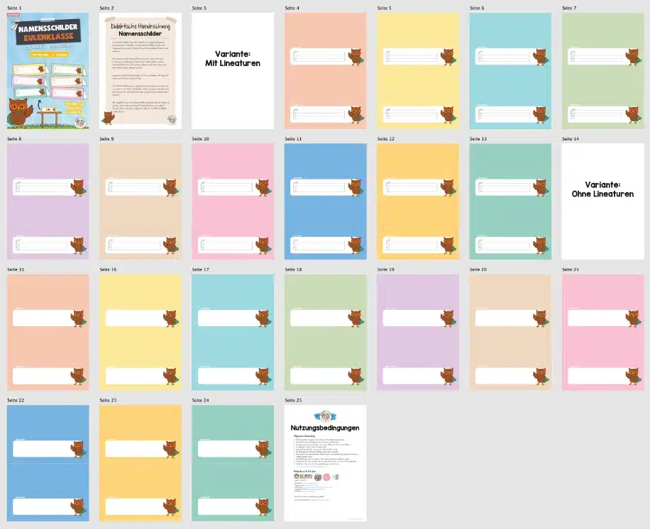 Die Namensschilder für die Eulenklasse helfen den Schülern, sich gegenseitig besser kennenzulernen. Außerdem sind die Namensschilder auch für euch Lehrpersonen eine gute Hilfe, die Namen der einzelnen Kinder schnell zu lernen.
