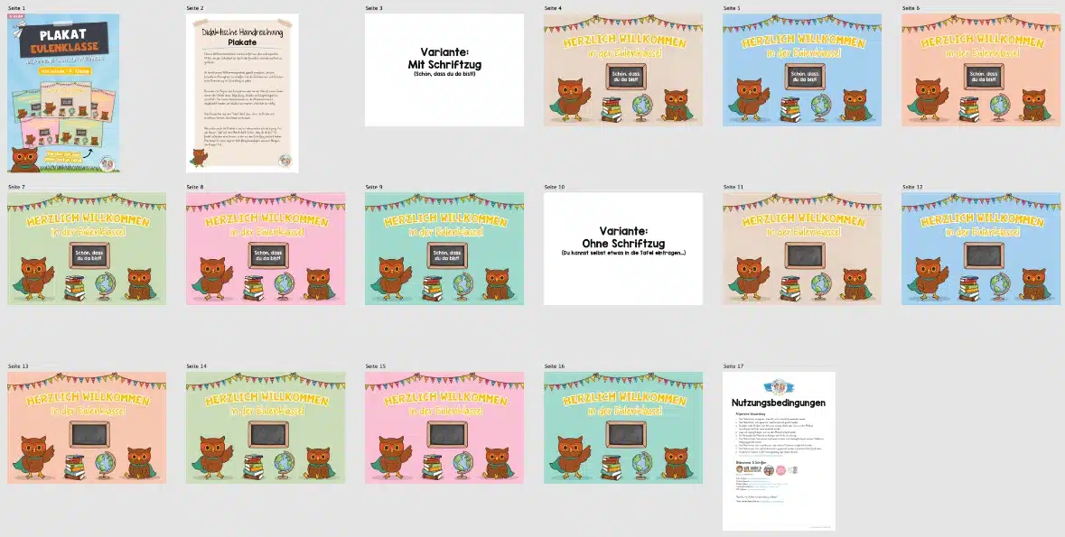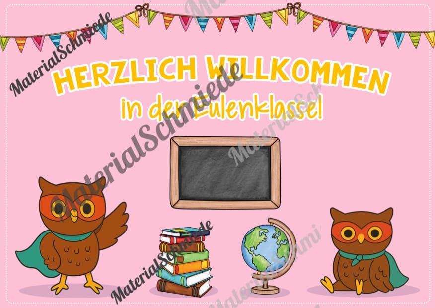 Hier findet ihr 6 Willkommensplakate für die Eulenklasse.