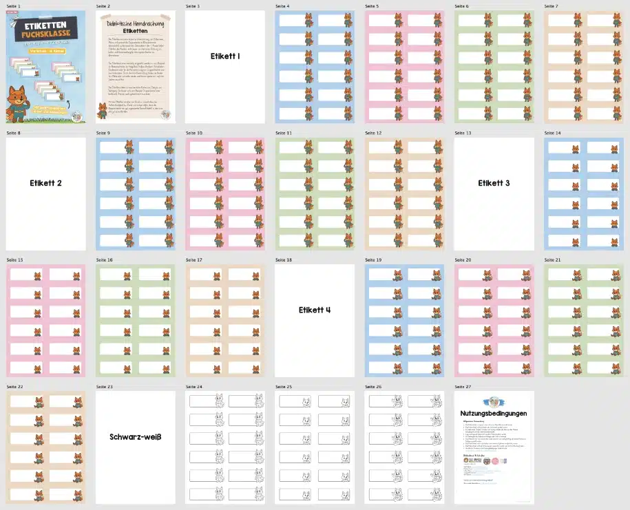 Die Etiketten können vielseitig eingesetzt werden – zum Beispiel für Namensschilder an Mäppchen, Heften, Büchern, Schubladen, Garderoben oder für die Kennzeichnung von Gruppentischen und Lernmaterialien. Durch die klare Beschriftung finden die Kinder ihre Materialien schneller wieder und lernen spielerisch, auf ihre Sachen zu achten.