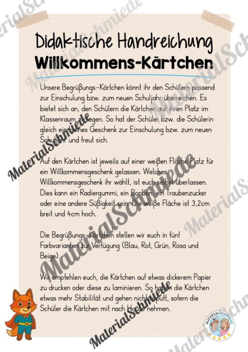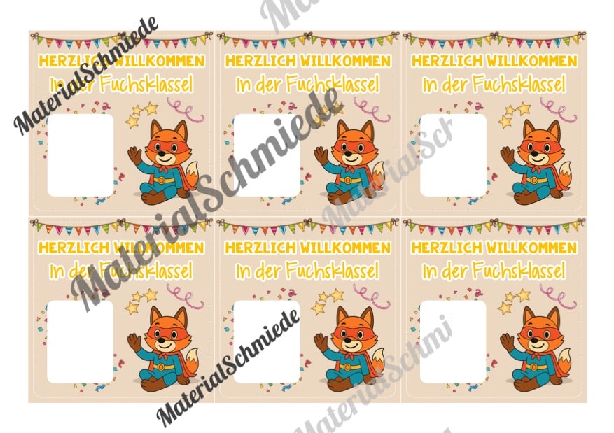 Auf den Kärtchen ist jeweils auf einer weißen Fläche Platz für ein Willkommensgeschenk gelassen. Welches Willkommensgeschenk ihr wählt, ist euch selbst überlassen. Dies kann ein Radiergummi, ein Bonbon, ein Traubenzucker oder eine andere Süßigkeit sein. Die weiße Fläche ist 3,2cm breit und 4cm hoch.