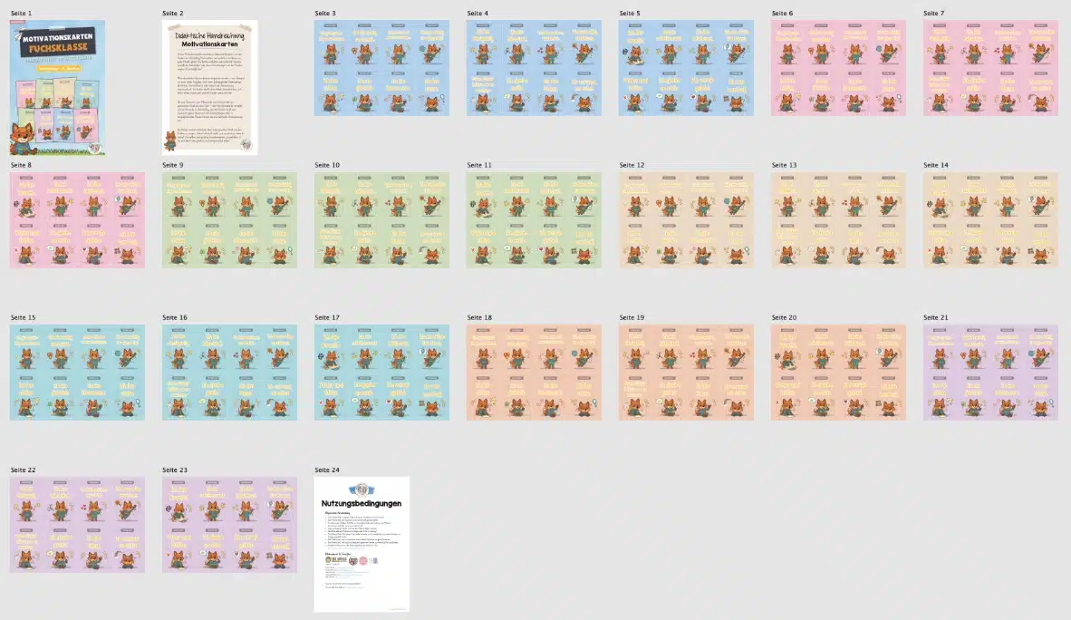 Insgesamt findet ihr in dem PDF 24 Motivationskarten. Auf einer DIN A4-Seite sind jeweils 8 Karten mit 8 Posen des Tieres zu sehen. Auf den zwei weiteren DIN A4-Seiten sind die Posen identisch, jedoch die Sprüche und kleinen Bildchen unterschiedlich. Die 24 Motivationskarten stellen wir euch in 7 Farben zur Verfügung. So könnt ihr euch für eine Farbe entscheiden oder diese bunt durchmischen.