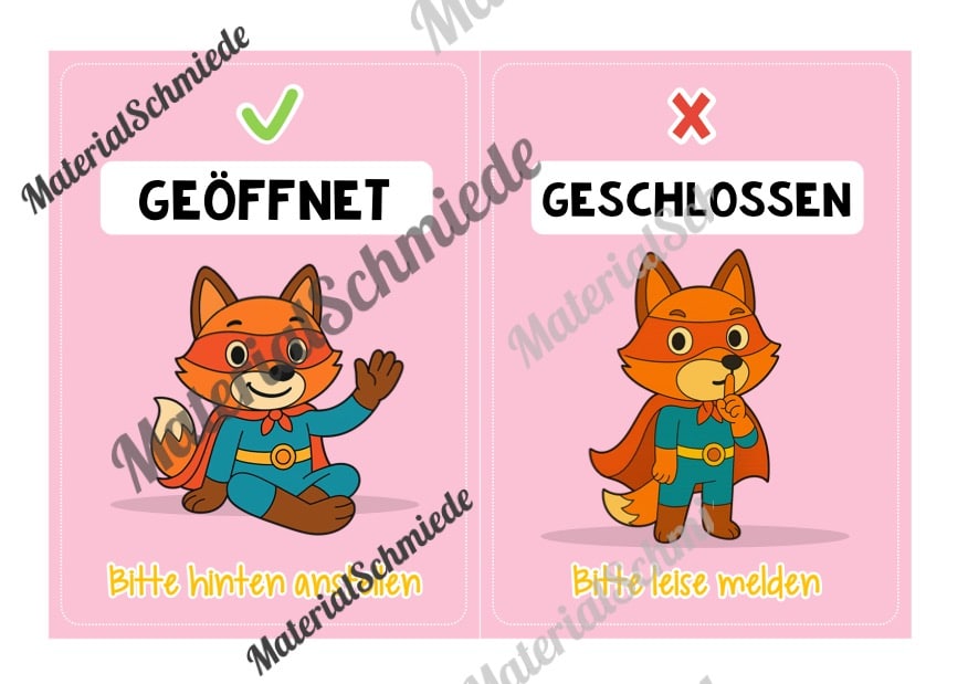 Die Karte „Geöffnet – bitte hinten anstellen“ zeigt den Kindern, dass sie in diesem Moment Fragen direkt am Pult klären können. Dabei lernen die Kinder, sich in einer kleinen Warteschlange zu organisieren und zu warten, bis sie an der Reihe sind. Die Karte hilft dabei, dass der Ablauf ruhig bleibt und nicht zu viele Kinder gleichzeitig ans Pult drängen.