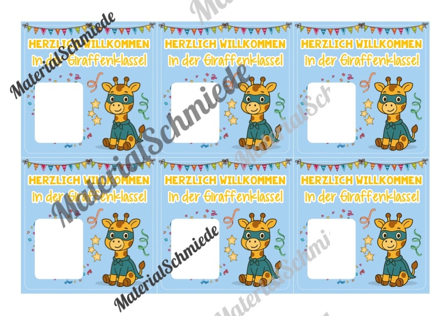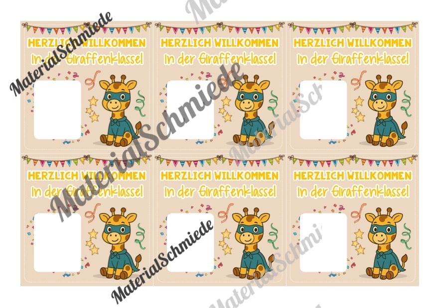 Auf den Kärtchen ist jeweils auf einer weißen Fläche Platz für ein Willkommensgeschenk gelassen. Welches Willkommensgeschenk ihr wählt, ist euch selbst überlassen. Dies kann ein Radiergummi, ein Bonbon, ein Traubenzucker oder eine andere Süßigkeit sein. Die weiße Fläche ist 3,2cm breit und 4cm hoch.