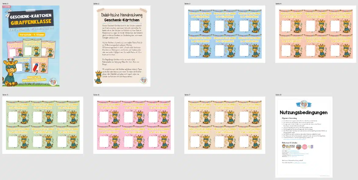 Hier findet ihr 5 Geschenk-Kärtchen für die Giraffenklasse.