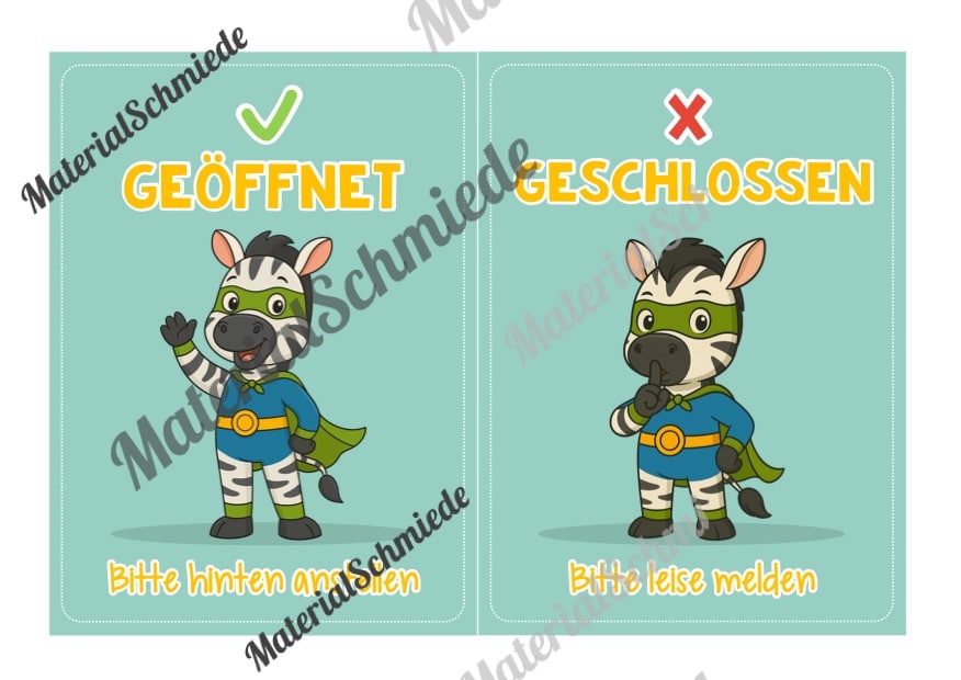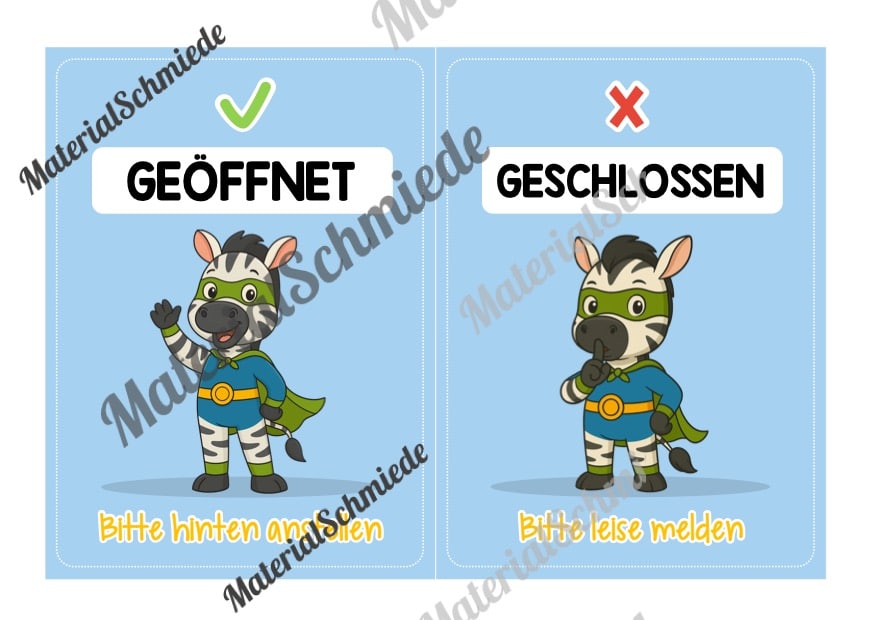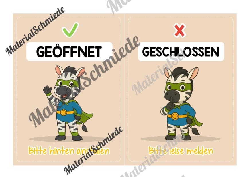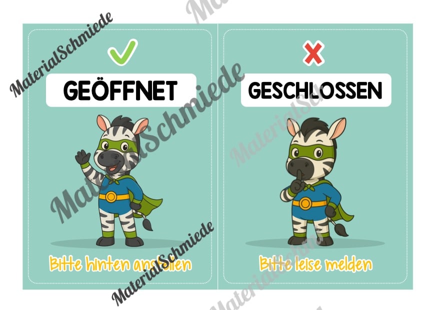 Die Karte „Geöffnet – bitte hinten anstellen“ zeigt den Kindern, dass sie in diesem Moment Fragen direkt am Pult klären können. Dabei lernen die Kinder, sich in einer kleinen Warteschlange zu organisieren und zu warten, bis sie an der Reihe sind. Die Karte hilft dabei, dass der Ablauf ruhig bleibt und nicht zu viele Kinder gleichzeitig ans Pult drängen.