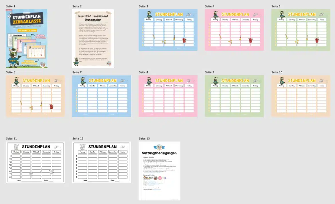 Die hier zu findenden Stundenpläne sind so gestaltet, dass sie den Kindern in der 1. Klasse den Einstieg in den Schulalltag erleichtern. Gerade am Anfang ist es für die Kinder wichtig, sich in der neuen Umgebung zurechtzufinden und ein Gefühl für den Ablauf des Tages zu entwickeln. Der Stundenplan kann dabei als eine Art roter Faden dienen, der den Kindern Sicherheit gibt.