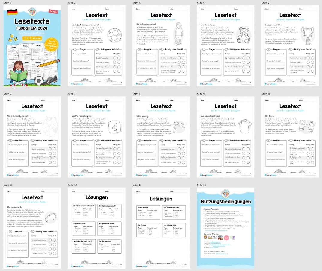 Die Kinder sollen sich jeweils einen Text durchlesen. Anschließend wird das Leseverständnis auf zwei verschiedene Arten abgefragt. Zum einen sollen die Kinder ein Wort zu einer Frage aufschreiben, zum anderen Aussagen mit richtig oder falsch beantworten (ankreuzen). Auf dem PDF sind insgesamt 10 Lesetexte rund um die Fußball Europameisterschaft 2024 vorhanden.