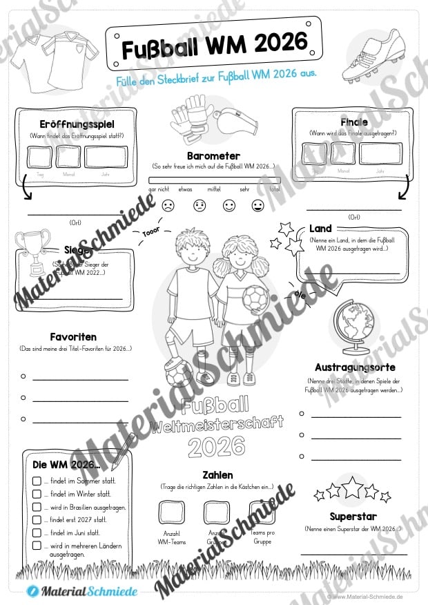 Mit diesem liebevoll gestalteten Steckbrief zur Fußball WM 2026 erstellen Kinder einen eigenen Steckbrief zum Turnier und setzen sich spielerisch mit wichtigen Fakten auseinander. Das Arbeitsblatt eignet sich ideal für den Einsatz im Sachunterricht, zur aktuellen WM oder als motivierender Schreibanlass rund um das Thema Fußball.