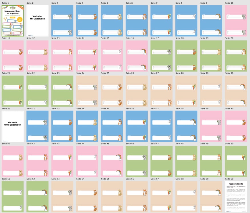 Insgesamt warten 7 verschiedene Namensschilder mit unterschiedlichen Abbildungen auf euch bzw. auf die Kinder. Außerdem gibt es die Namensschilder mit verschiedenen Hintergrundfarben.