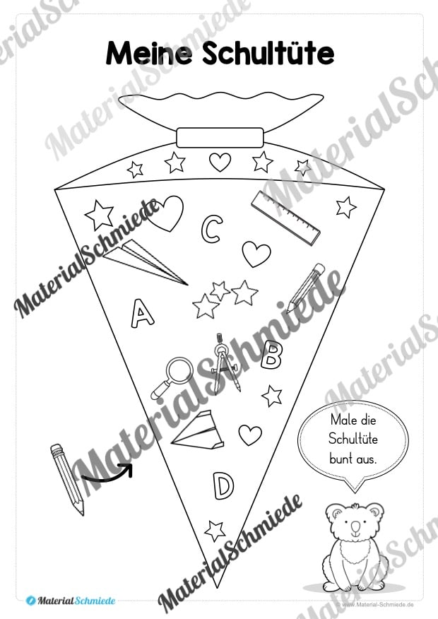- Leere Schultüte mit Koala und Sprechblase (hier könnt ihr selbst einen Text verfassen)