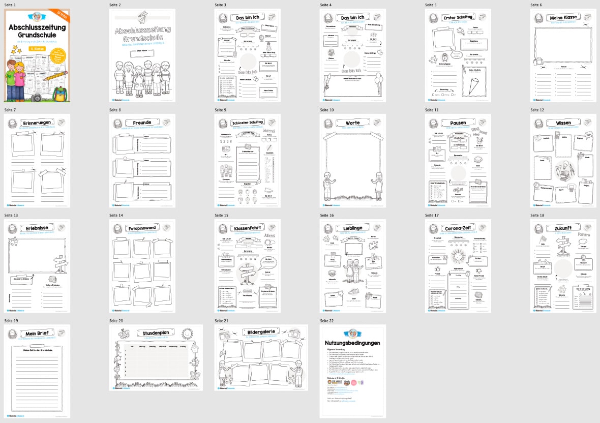 Alle Seiten in der Abschlusszeitung sind spielerisch aufgebaut in Form von unterschiedlichen Steckbriefen. So können die Kinder ihre Grundschulzeit Revue passieren lassen und haben ein schönes Erinnerungs-Heftchen an die Zeit in der Grundschule. Dabei sollen die Kinder verschiedene Fragen zur Grundschulzeit stichwortartig beantworten, Fotos einkleben und die vielen kleinen Bildchen ausmalen.