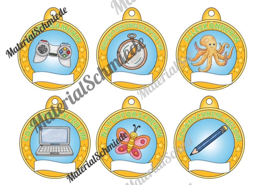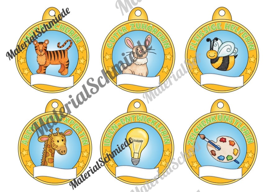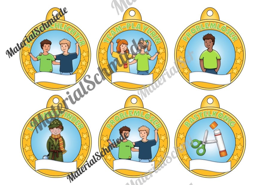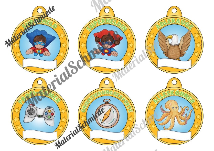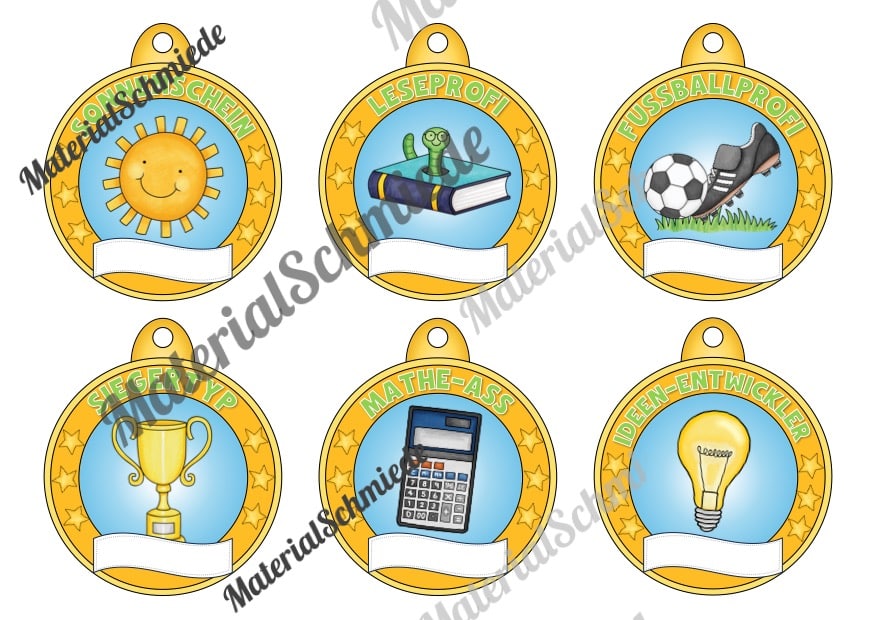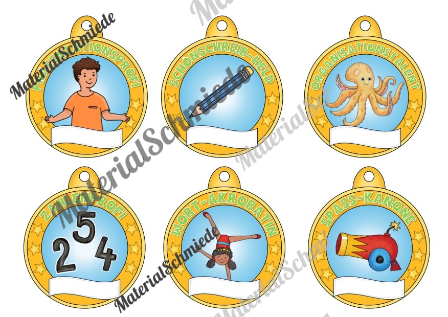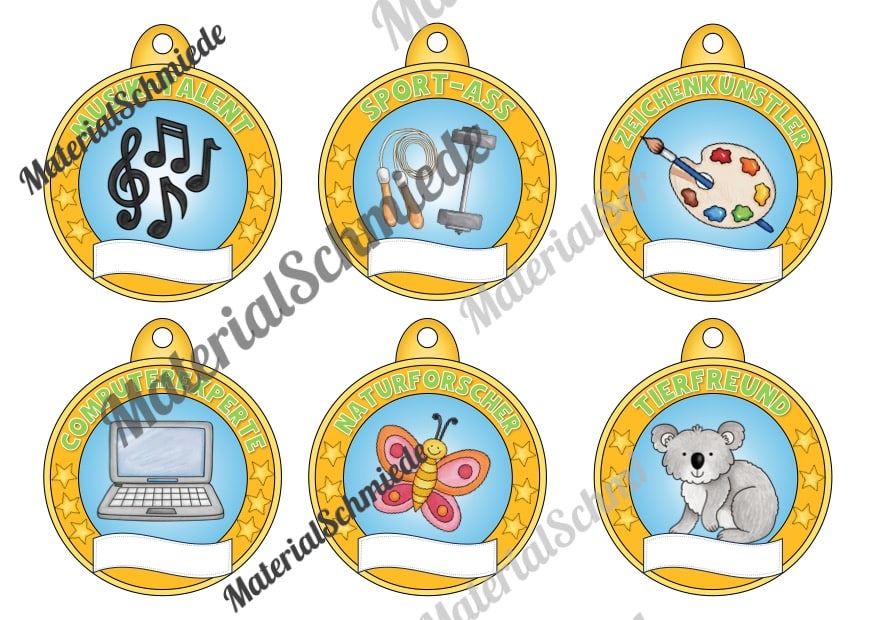 Oben auf den Medaillen ist ein Schriftzug mit einer besonderen Eigenschaft bzw. Auszeichnung aufgeführt. Passend dazu ist jeweils ein Bild vorhanden, welches die Auszeichnung bildlich unterstützt. Unten auf der Medaille ist ein leere Feld vorhanden, in welches ihr den Namen des Schülers bzw. der Schüler eintragen könnt.