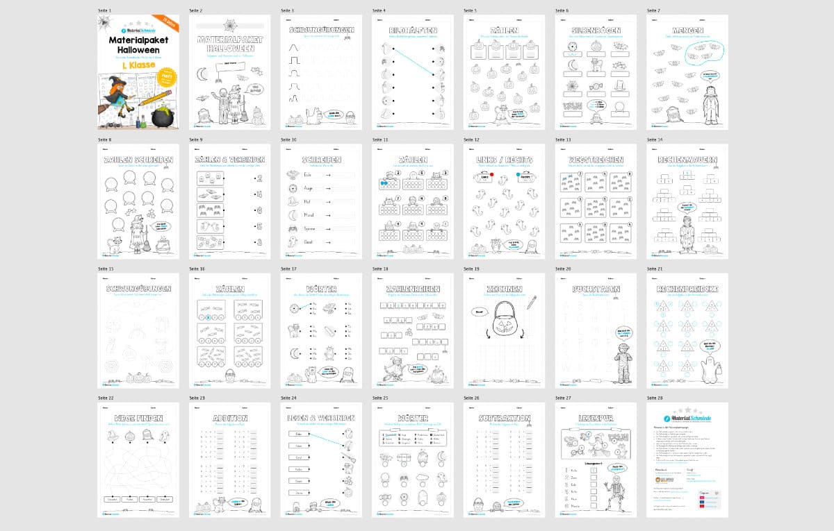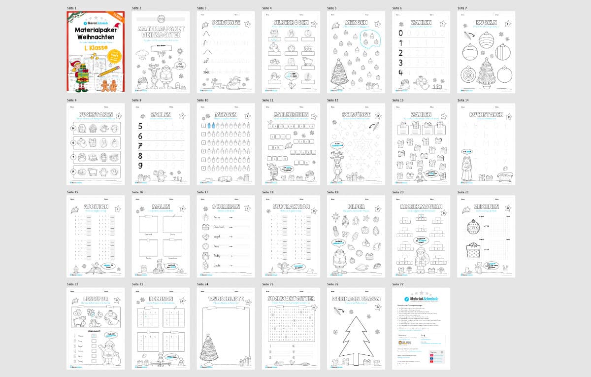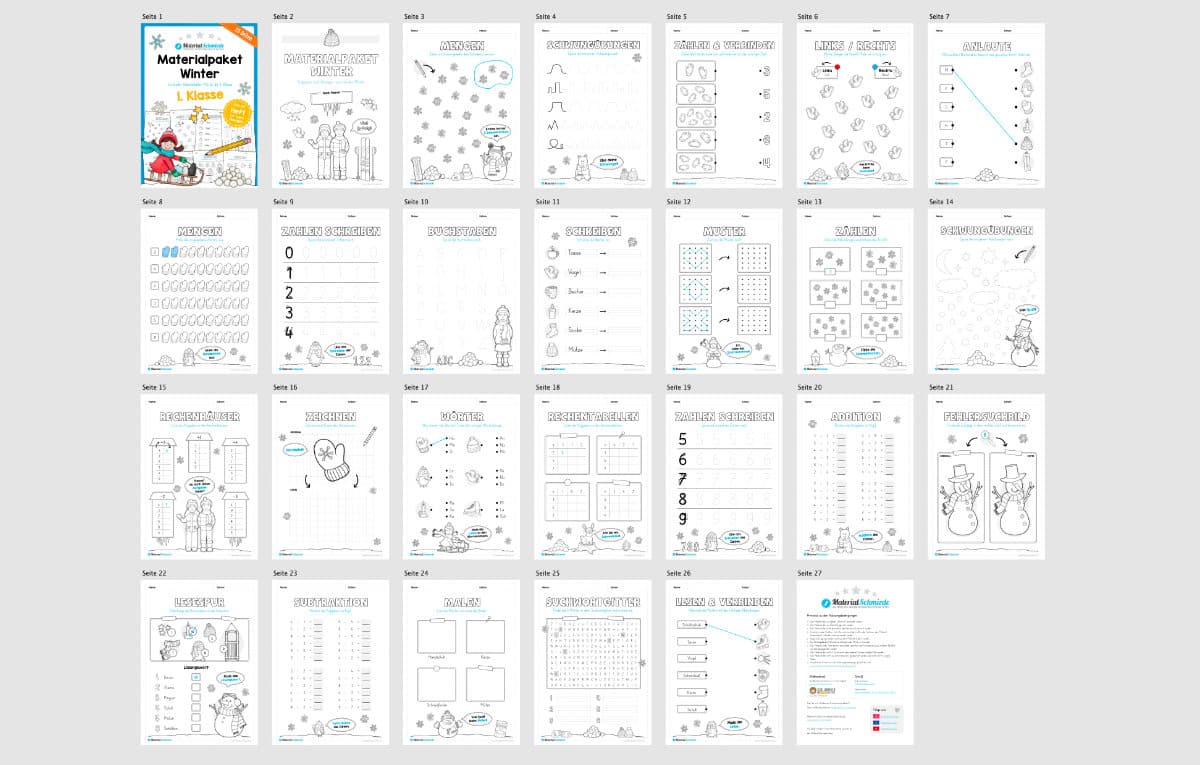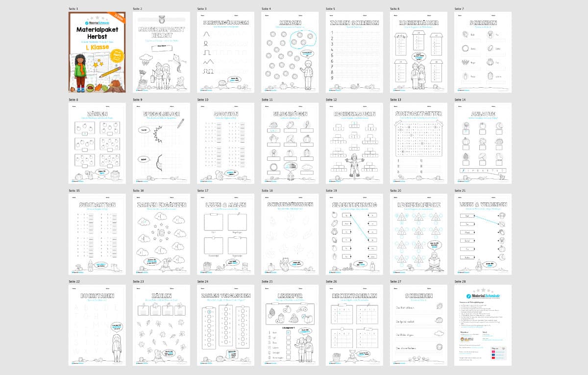 Jedes Materialpaket besitzt 25 Seiten. Darin sind verschiedene Übungen aus den Bereichen Deutsch und Mathe enthalten. Zusätzlich haben wir einige Rätsel hinzugefügt, sodass die Schüler die Hefte mit Spaß und Motivation bearbeiten und so auf spielerische Art und Weise lernen.