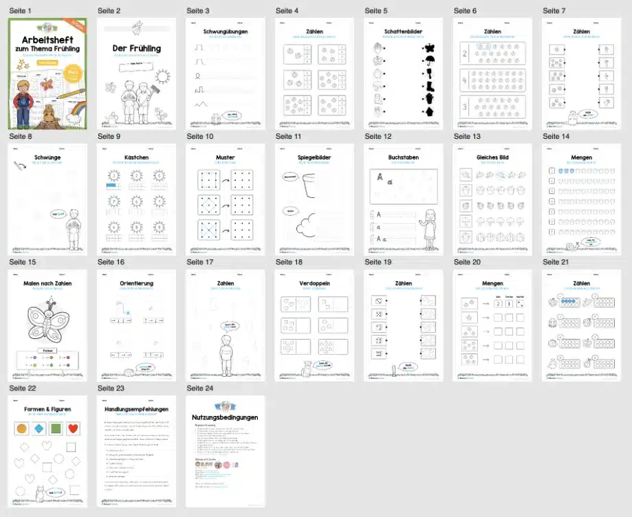 Parallel bzw. zusätzlich könnt ihr auch gut unser Mini-Heftchen zum Frühling für die Vorschule im A5 Format einsetzen, in dem ähnliche, jedoch andere Übungen für die Kinder enthalten sind.