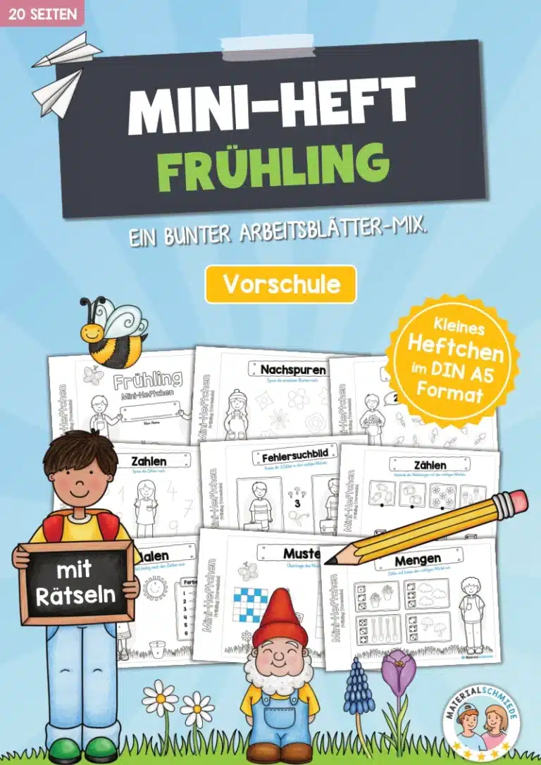 Hier findet ihr ein Mini-Heftchen zum Thema Frühling für die Vorschule bestehend aus insgesamt 20 Seiten.