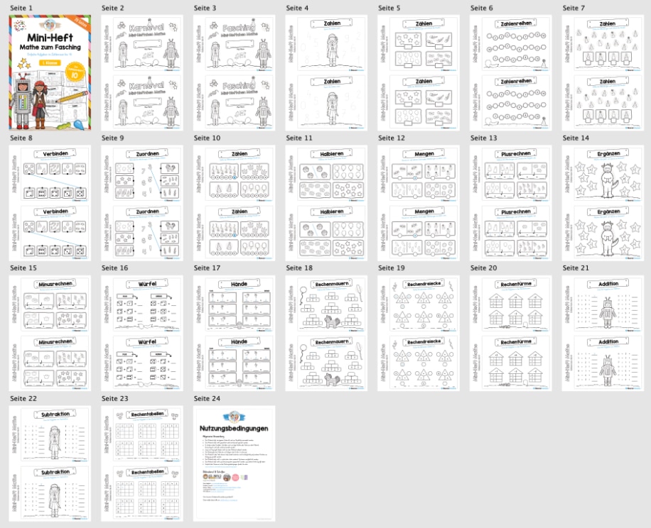 Dieses Mini-Heft enthält insgesamt 20 Mathe Übungen rund um Fasching/Karneval im Zahlenraum bis 10.
